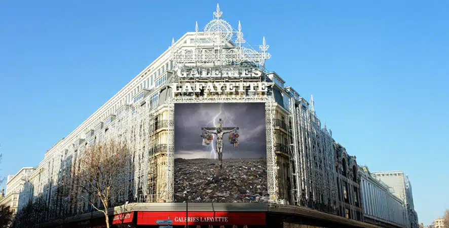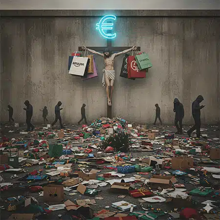 Banksy, cet énigmatique génie. Il met le Christ en croix avec des sacs de courses aux mains à la place des stigmates ! Les paquets Amazon Prime et les cartes de crédit ont remplacé la souffrance et la mémoire.